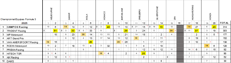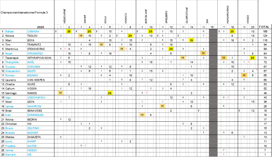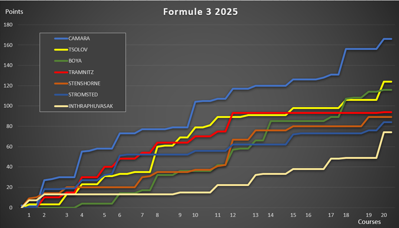 Après trois saisons serrées, au point que le champion 2024 avait remporté le titre sans victoire, un pilote a survolé la saison 2025 laissant ses poursuivants se disputer les restes. Pourtant débutant, Rafael CAMARA a montré une maturité dans l’approche de sa saison ainsi qu’une vitesse intrinsèque montrant qu’il est déjà prêt pour la F2. Autre événement de l’année, c’est le titre équipe remporté pour la première fois par CAMPOS, principalement grâce à TSOLOV et enfin à BOYA dont le nouveau statut de pilote Aston Martin fut un coup de boost.