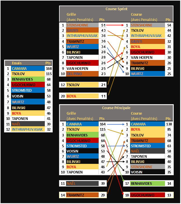Le schéma ci-contre a pour objectif de résumer la saison en montrant, à partir des qualifications, des grilles de départ type des courses sprints et principales, les pilotes ayant le mieux géré leurs potentiels.